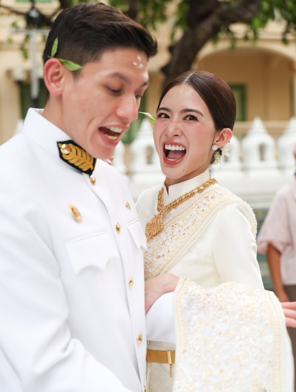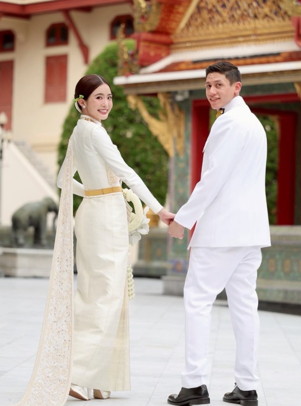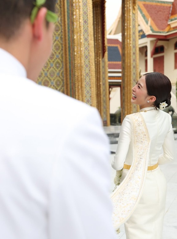 พิธีจัดขึ้นอย่างเรียบง่ายแต่แฝงไปด้วยความอบอุ่น ท่ามกลางครอบครัวและคนใกล้ชิดที่มาร่วมอวยพร โดยสาวมายด์มาในลุค ชุดไทยประยุกต์สีครีมทอง เรียบหรูดูสง่างาม สมฐานะสะใภ้อาณาจักรหมื่นล้าน สวยหวานจับตาอย่างแท้จริง