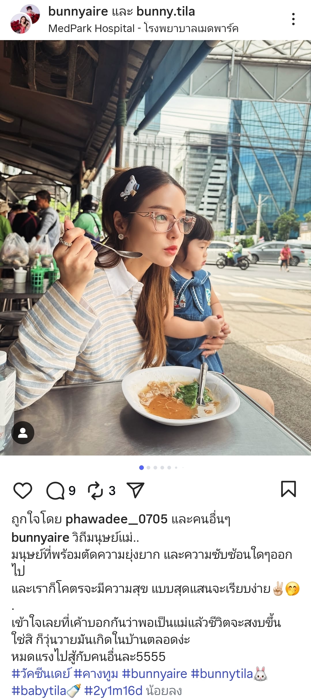 หลังจากพา น้องฑิลาร์ ไปฉีดวัคซีนและพบคุณหมอที่โรงพยาบาลเสร็จเรียบร้อย แทนที่จะเลือกหาร้านอาหารหรูหรา แอร์ กลับตัดสินใจพาลูกสาวแวะทานข้าวที่ ร้านริมทางข้างโรงพยาบาล อย่างเรียบง่าย ซึ่งเธอได้ยกให้โมเมนต์ดังกล่าวเป็น ความสุขสุดแสนจะเรียบง่าย ที่เธอค้นพบจากการใช้ชีวิตเป็นแม่