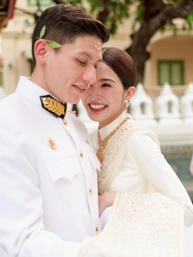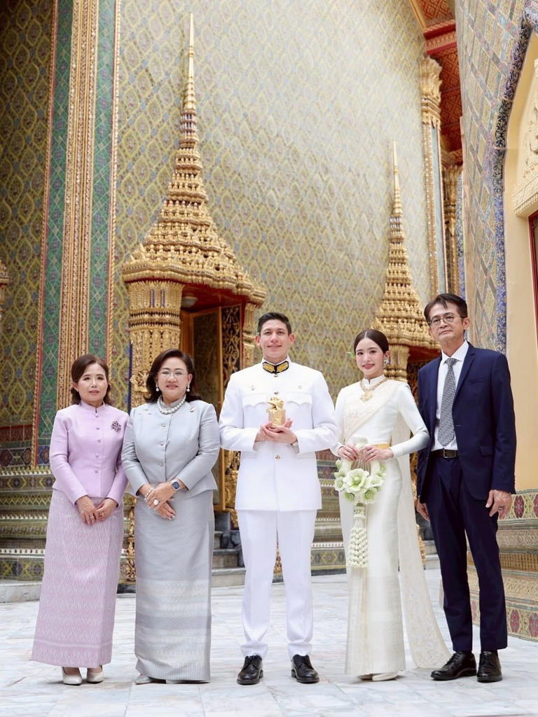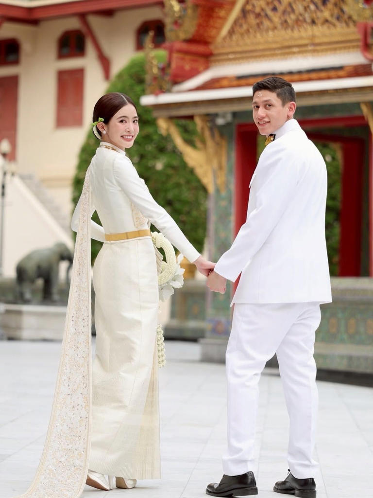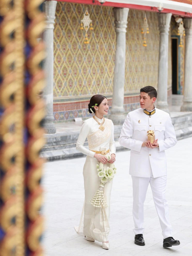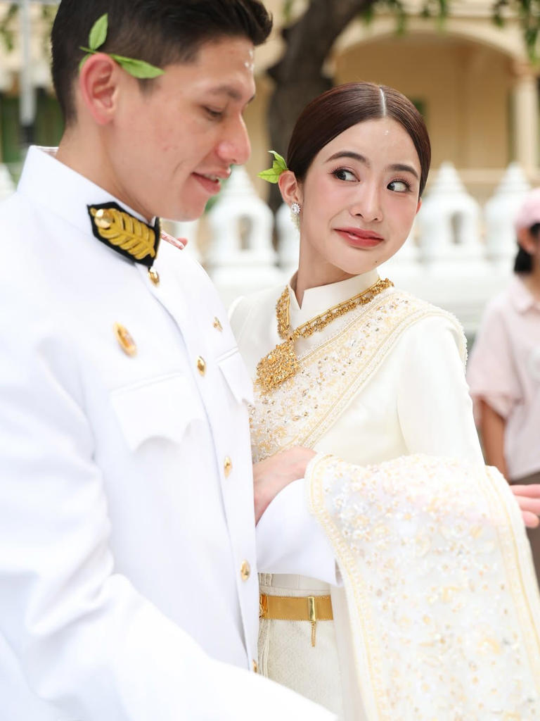 ซึ่งในวันสำคัญนี้เจ้าสาวมายด์ สวยหวานออร่าจับสุดๆ มาในชุดไทยศิวาลัยสีงาช้างดูสง่าและเรียบร้อยสุดๆ ส่วนเจ้าบ่าวมาในเครื่องแบบสีขาวสะอาด ดูภูมิฐาน เหมาะสมเหมือนกิ่งทองใบหยก และก็มีครอบครัวของทั้งคู่มาร่วมเป็นสักขีพยานในวันนี้
