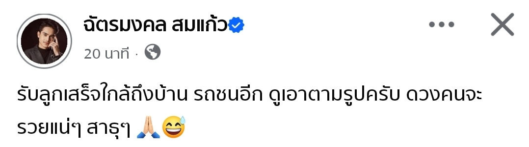 เรียกได้ว่าเรื่องร้ายกลายเป็นดี เพราะทุกคนในรถทั้งคุณพ่อ “ยิว ฉัตรมงคล” และ “น้องยูจิน” ปลอดภัยดีทุกประการ หายห่วงจ้า! ส่วนเรื่องโชคลาภที่ว่านั้น คงต้องจับตาดูกันต่อไปว่าคุณพ่อยิวจะดวงเฮงจริงอย่างที่ว่าไว้หรือไม่!