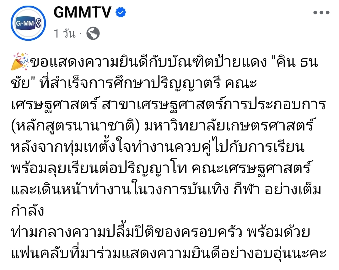 ความสำเร็จครั้งนี้ถือเป็นการตอกย้ำความทุ่มเทของหนุ่มคิน ที่สามารถทำงานในวงการบันเทิง ทั้งงานซีรีส์และผลงานเพลง ควบคู่ไปกับการเรียนได้อย่างยอดเยี่ยม โดยล่าสุด ทาง GMMTV ได้โพสต์ภาพแห่งความสุขของบัณฑิตป้ายแดง พร้อมกับข้อความแสดงความยินดีที่ระบุชัดเจนถึงการไม่หยุดพัฒนาของคิน