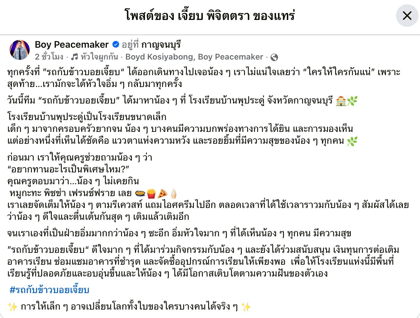 เพื่อมอบความสุข ความอิ่มท้อง และความอบอุ่น ครั้งนี้เดินทางไปมอบให้กับน้องๆเด็กๆโรงเรียนบ้านพุปะระดู่ จังหวัดกาญจนบุรี โดย บอย & เจี๊ยบ ได้กลั่นกรองจากความรู้สึกบรรจงเขียนข้อความในการเดินทางครั้งนี้ของ “รถกับข้าวบอยเจี๊ยบ” เรียงร้อยออกมาเป็นตัวหนังสือไว้ดังนี้