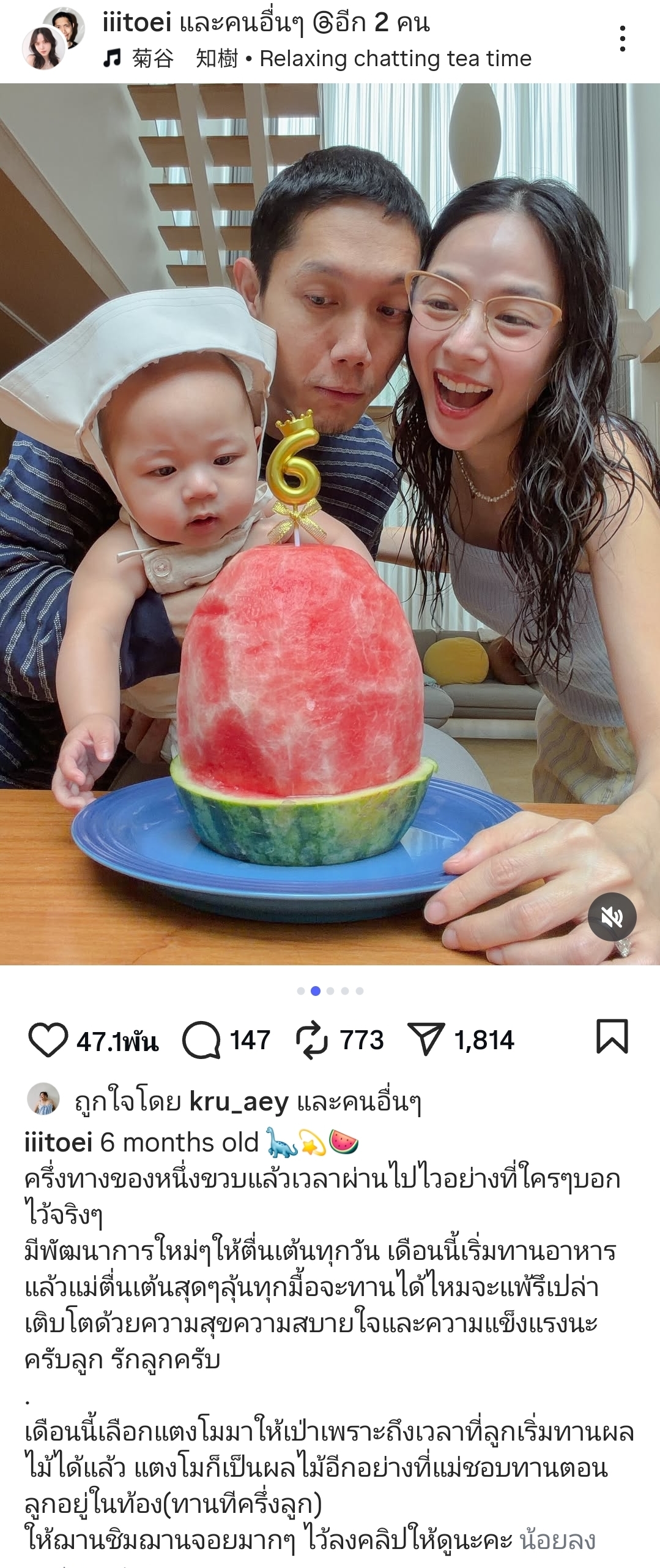 ภาพของน้องฌานที่สวมชุดบอดี้สูทสีอ่อนและหมวกสุดเก๋ นั่งเอียงคอทำตาแป๋ว มองกล้องข้างๆ แตงโมก้อนโตนั้น แสดงให้เห็นถึงความน่ารักน่าฟัดที่เพิ่มขึ้นทุกวัน จนทำเอาแฟนๆ แห่คอมเมนต์ว่า “หลงไม่ไหวแล้วลูกกกก” และชื่นชมในความช่างคิดของคุณแม่ที่เลือกเค้กแตงโมมาฉลองอายุครึ่งขวบอย่างสร้างสรรค์