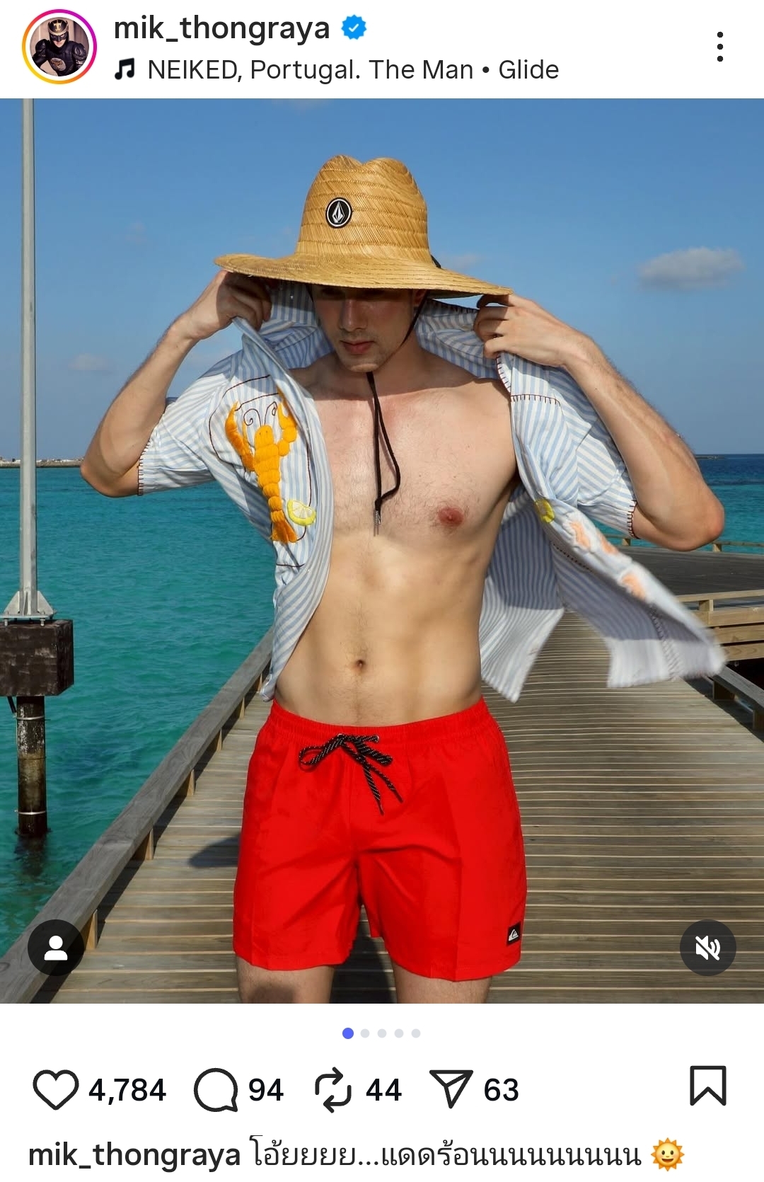 แต่ดูเหมือนว่าความร้อนที่มิกค์สัมผัสจะไม่เท่ากับความร้อนแรงที่เจ้าตัวปล่อยออกมา เพราะภาพที่ มิกค์ เลือกมานั้น เป็นช็อตที่เจ้าตัวแกล้งๆ โพสท่าเปิดเสื้อโชว์กล้ามท้องเบาๆ ซึ่งมาพร้อมกับคอมเมนต์จากแฟนคลับที่ส่ง อิโมจิไฟลุก และคำว่า “องศาเดือด” มาแบบไม่ขาดสาย ชัดเจนว่าลุคสบายๆ ในชุดลายกุ้งนี้ ทำเอาหลายคนใจสั่นไปหมดแล้ว! ใครที่กำลังมองหาความสดใสปนความแซ่บ ต้องยกให้เซ็ตภาพนี้ของ มิกค์ ทองระย้า เป็นหนึ่งในตำนานของวันพักผ่อนสุดปังประจำปีนี้เลยค่ะ!