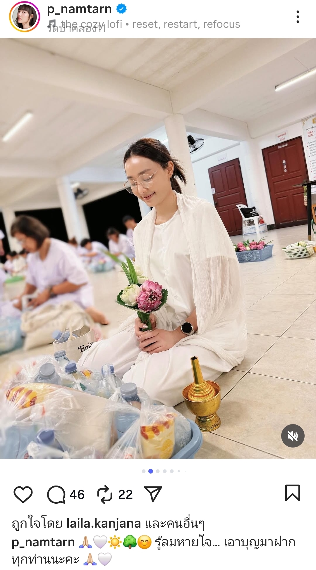 ​พร้อมกันนี้ น้ำตาล ยังได้เขียนแคปชั่นสั้น ๆ แต่กินใจว่า “รู้ลมหายใจ… เอาบุญมาฝากทุกท่านนะคะ” ซึ่งหลังจากที่ภาพเหล่านี้เผยแพร่ออกไป ก็มีเพื่อนร่วมวงการและชาวเน็ตจำนวนมากเข้ามาร่วมอนุโมทนาบุญ และชื่นชมในความงามสง่าของเธอในลุคสาวสวยสายบุญ เชื่อว่าการได้พักจิตใจในครั้งนี้จะทำให้เธออิ่มบุญอิ่มใจ และมีพลังกลับมาทำงานอย่างเต็มที่แน่นอน