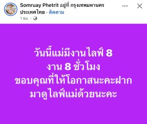 ด้านแม่เกตุ ก็ปังไม่แพ้กันมูฟออน กระแสดราม่า พลิกวิกฤตให้เป็นโอกาส รับงานไลฟ์รัวๆ เช่นเดียวกัน ล่าสุด 15 ตุลาคม 68 แม่เกตุได้โพสต์ผ่านเฟซบุ๊กส่วนตัว พร้อมระบุข้อความว่า “วันนี้แม่มีงานไลฟ์ 9งาน 8 ชั่วโมง ขอบคุณที่ให้โอกาสนะคะฝากมาดูไลฟ์แม่ด้วยนะคะ”