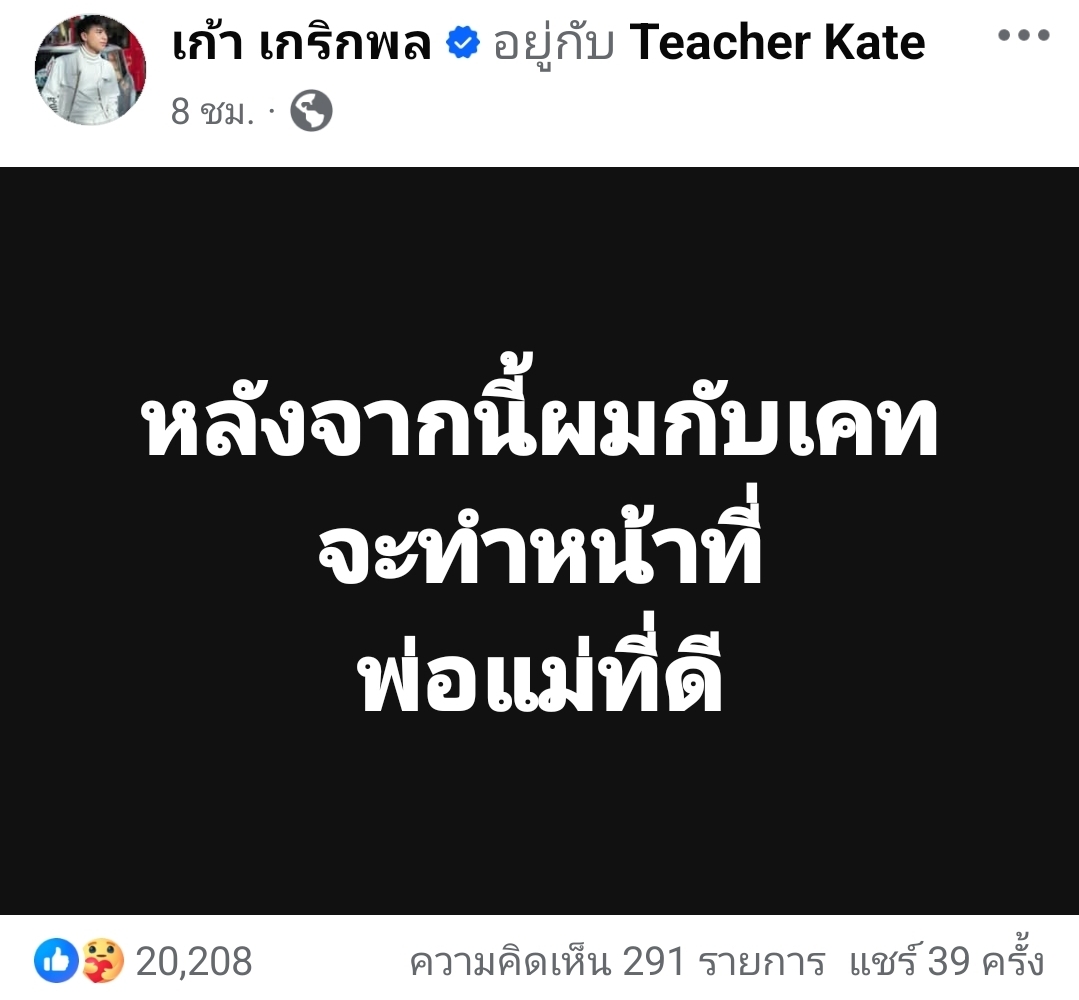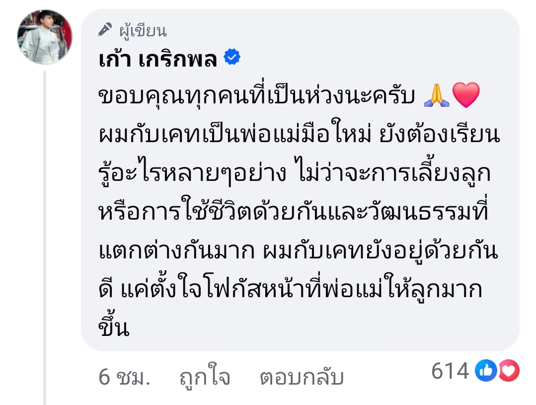 อย่างไรก็ตาม “เก้า เกริกพล” ก็ไม่ปล่อยให้แฟนๆ ต้องเป็นห่วงนาน รีบเข้ามาตอบคอมเมนต์เพื่อคลายความสงสัยทันทีว่า “ขอบคุณทุกคนที่เป็นห่วงนะครับ ผมกับเคทเป็นพ่อแม่มือใหม่ ยังต้องเรียนรู้อะไรหลายๆ อย่าง ไม่ว่าจะการเลี้ยงลูกหรือการใช้ชีวิตด้วยกันและวัฒนธรรมที่แตกต่างกันมาก ผมกับเคทยังอยู่ด้วยกันดี แค่ตั้งใจโฟกัสหน้าที่พ่อแม่ให้ลูกมากขึ้น”
