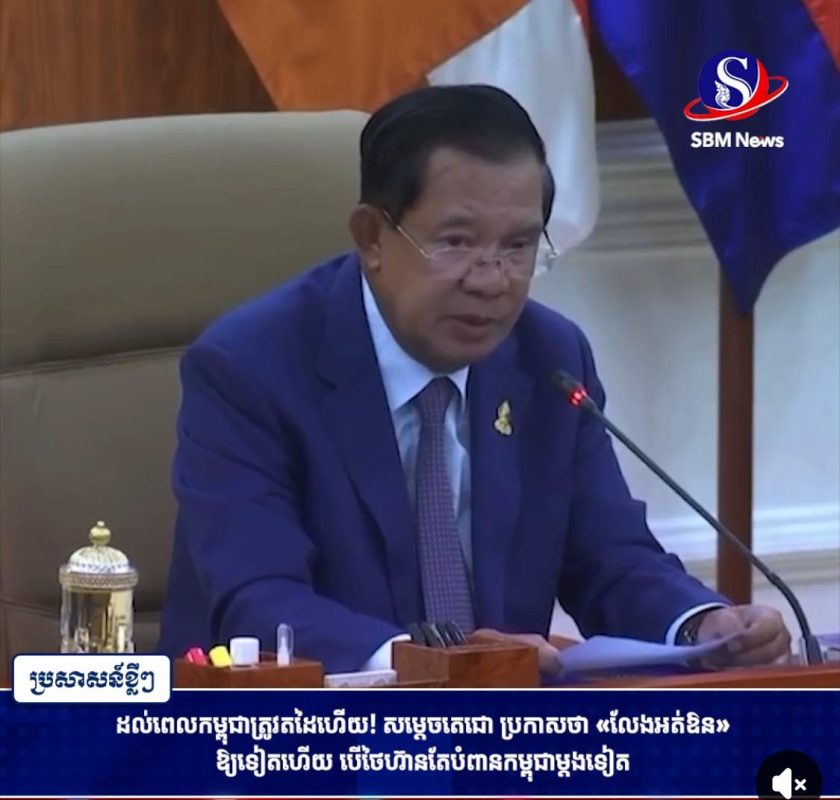 วันนี้(16 ต.ค.) เฟซบุ๊กเพจสำนักข่าว SBM News ของกัมพูชาได้โพสต์ข้อความว่า “ถึงเวลาที่กัมพูชาต้องสู้กลับ! สมเด็จฮุนเซนประกาศว่า จะไม่ยอมอดทนอีกต่อไป หากไทยกล้าละเมิดกัมพูชาอีกครั้ง และในวันนี้ สถานการณ์เลวร้ายอาจเกิดขึ้น เราจะเผยแพร่วิดีโอคำปราศรัยโดยตรงของท่านสมเด็จฮุนเซนในเร็วๆ นี้”