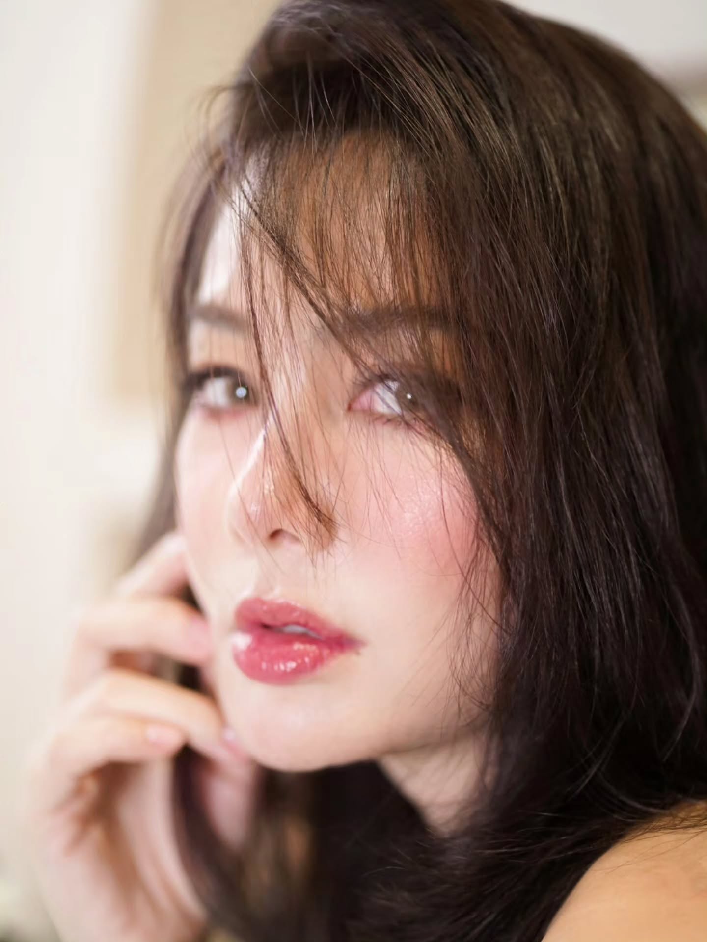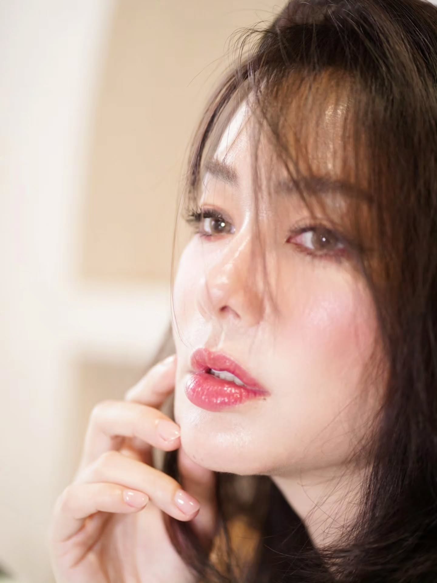 ผมสีน้ำตาลเข้มดัดปลายพริ้ว ๆ รับกับเมคอัพโทนชมพูระเรื่อ ผิวฉ่ำวาว และริมฝีปากสีโรสสุดเย้ายวน — รวมแล้วออกมาละมุนแต่แฝงความแซ่บเกินต้าน