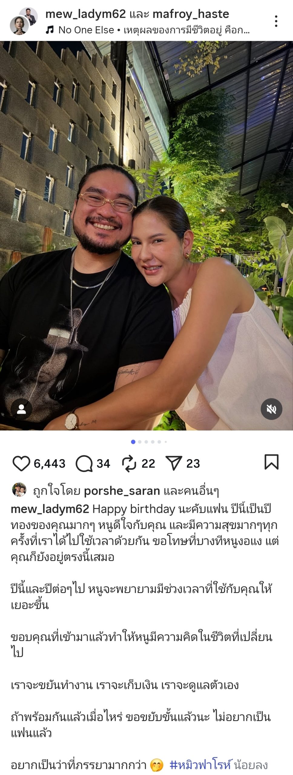 ในข้อความดังกล่าว สส.หมิว ได้เปิดใจอย่างลึกซึ้งถึงผลกระทบเชิงบวกที่แฟนหนุ่มนำเข้ามาในชีวิต “ขอบคุณที่เข้ามาแล้วทำให้หนูมีความคิดในชีวิตที่เปลี่ยนไป” พร้อมกับให้คำมั่นสัญญาเรื่องอนาคตร่วมกันว่า “เราจะขยันทำงาน เราจะเก็บเงิน เราจะดูแลตัวเอง” แสดงให้เห็นถึงการวางแผนชีวิตคู่ที่มั่นคง