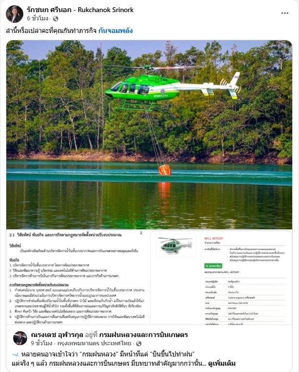 วันที่ 18 ตุลาคม 2568 นายณรงเดช อุฬารกุล สส.บัญชีรายชื่อ พรรคประชาชน (ปชน.) ได้โพสต์ภาพเฮลิคอปเตอร์สีเขียว รุ่นเกษตร 2311 พร้อมกับข้อความผ่านเฟซบุ๊กส่วนตัวชี้แจงถึง 5 บทบาทหน้าที่หลัก ของกรมฝนหลวงและการบินเกษตร เพื่อนำไปสู่การตรวจสอบการปฏิบัติภารกิจนอกเหนือจากงานหลัก โดยนายณรงเดชระบุว่า ภารกิจหลักของกรมฝนหลวงและการบินเกษตร คือ กำหนดนโยบายยุทธศาสตร์และแผนแม่บทเกี่ยวกับการบริหารจัดการน้ำในชั้นบรรยากาศและการประสานงานกับหน่วยงานน้ำต่าง ๆ ปฏิบัติการทำฝนหลวงเพื่อเพิ่มปริมาณน้ำแก้ภัยแล้ง และช่วยเหลือพื้นที่ประสบภัยพิบัติ ศึกษาวิจัยและพัฒนาเทคโนโลยีฝนหลวงและการดัดแปรสภาพอากาศ ปฏิบัติการด้านการบินและการสื่อสาร สนับสนุนภารกิจฝนหลวง การวิจัย และการเกษตร ซึ่งหากจะมีภารกิจอื่นใดนอกเหนือจากแผนหลักของกรม จะต้องเป็นการมอบหมายตามข้อ 5 เท่านั้น