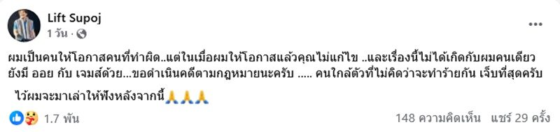 เดือดกลางโซเชียลเลยเมื่อ นักร้องนักแสดง ลิฟท์ สุพจน์ ไปเจออะไรมาถึงกับประกาศดำเนินคดีตามกฎหมายกับคนใกล้ตัวว่า “ผมเป็นคนให้โอกาสคนที่ทำผิด..แต่ในเมื่อผมให้โอกาสแล้วคุณไม่แก้ไข ..และเรื่องนี้ไม่ได้เกิดกับผมคนเดียว ยังมี ออย กับ เจมส์ด้วย…ขอดำเนินคดีตามกฎหมายนะครับ ….. คนใกล้ตัวที่ไม่คิดว่าจะทำร้ายกัน เจ็บที่สุดครับ ไว้ผมจะมาเล่าให้ฟังหลังจากนี้”