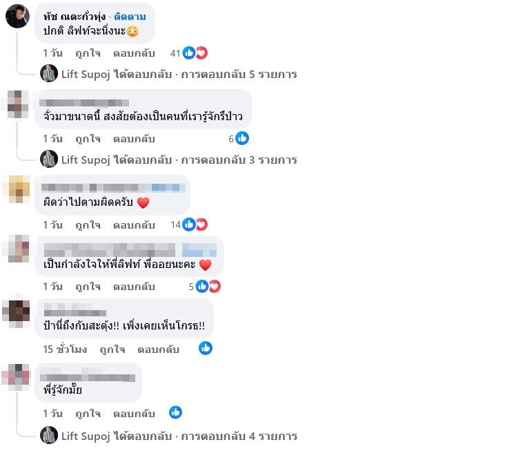 โดยต่อมาเพื่อนนักร้อง ทัช ณ ตะกั่วทุ่ง ก็มาคอมเมนต์ด้วยว่า “ปกติ ลิฟท์จะนิ่งนะ” ซึ่ง ลิฟท์ ก็มาคอมเมนต์บอกเลยว่า “เรื่องนี้ สุดครับ” ท่ามกลางคอมเมนต์เข้ามาให้กำลังใจจำนวนมาก