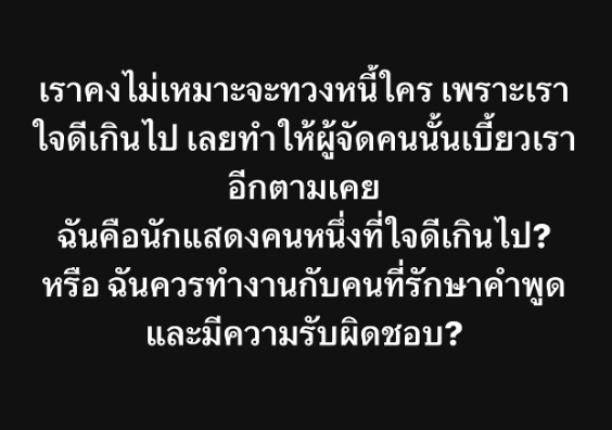 นักแสดงรุ่นใหญ่ บิ๊ก ศรุต ได้โพสต์ข้อความสุดเซ็งหลังการทวงหนี้แต่กลับถูกเบี้ยว เผยว่า “เราคงไม่เหมาะสมจะทวงหนี้ใคร เพราะเราใจดีเกินไป เลยทำให้ผู้จัดคนนั้นเบี้ยวเราอีกตามเคย ฉันคือนักแสดงคนหนึ่งที่ใจดีเกินไป? หรือ ฉันควรทำงานกับคนที่รักษาคำพูดและมีความรับผิดชอบ? ” พร้อมแคปชั่นว่า “เฮ้อออออ น่าเศร้าใจ โคตรห่วย”