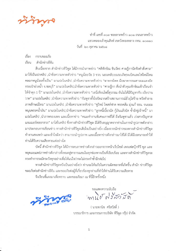 สำนักข่าวทีวีพูล มิได้รับอนุญาตจากท่านในการนำรูปภาพดังกล่าว มาประกอบการเขียนข่าว ทางสำนักข่าวทีวีพูล ขอโทษ และเสียใจเป็นอย่างยิ่ง ทางสำนักข่าวทีวีพูลจะกระทำการระมัดระวังทุกอย่างเพื่อให้แน่ใจว่าจะไม่กระทำซ้ำอีกต่อไป