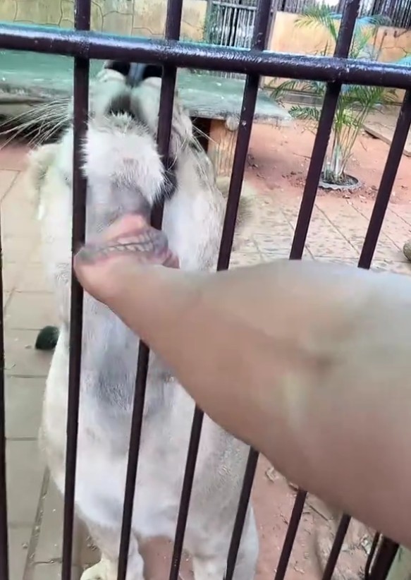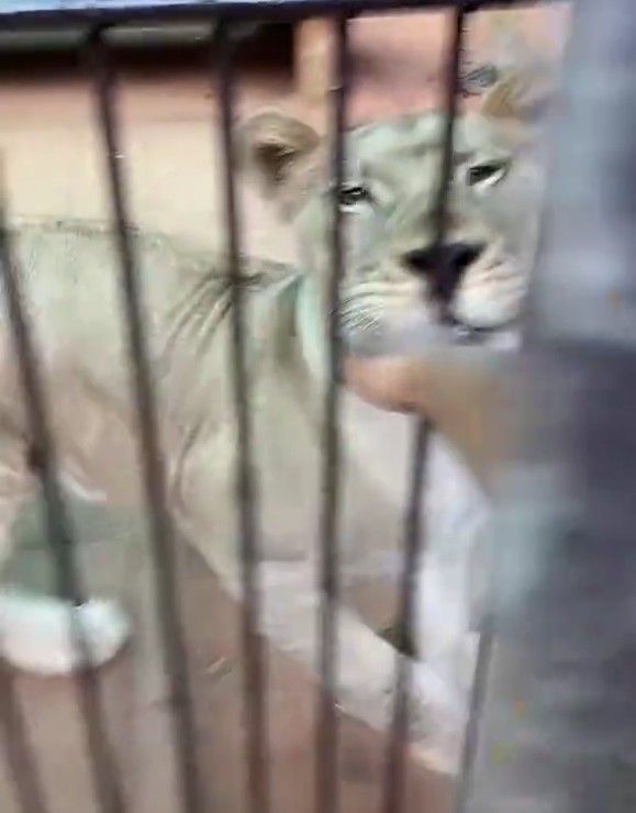 “สิงโตมเหสี” ยังคงเดินตามอ้อน “เจ้าของ” อยู่ไม่ห่าง ขณะที่เจ้าของเองก็ยกมือแตะกรงด้วยแววตาเต็มไปด้วยความรักและความคิดถึง