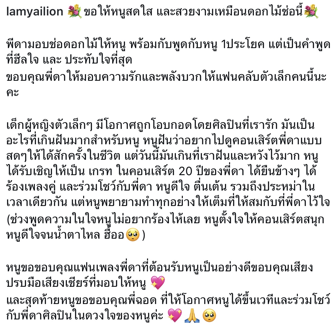 สาวลำไยยังเผยว่า ตัวเองเคยฝันแค่อยากไปดูคอนเสิร์ตพี่ดาสักครั้ง แต่วันนี้กลับได้ “ยืนข้างๆ ศิลปินในฝัน” ได้ร้องเพลงคู่ ได้โชว์ร่วมกันบนเวทีใหญ่ พร้อมเล่าวินาทีสุดกลั้นน้ำตา เมื่อพูดความในใจกลางคอนเสิร์ตว่า