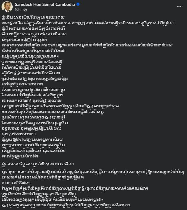 ที่สำคัญ “นายฮุน เซน” เห็นคลิป บอกว่ารู้สึกไม่พอใจเป็นอย่างมาก ที่เห็นชาวกัมพูชาทำเช่นนี้ จึงออกมาโพสต์ถึงนายเคซีโร่วัน ในลักษณะที่ไม่ค่อยพอใจ