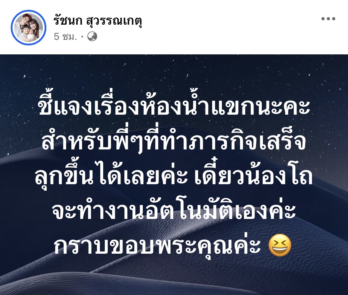 “ชี้แจงเรื่องห้องน้ำแขกนะคะ สำหรับพี่ ๆ ที่ทำภารกิจเสร็จ ลุกขึ้นได้เลยค่ะ เดี๋ยวน้องโถจะทำงานอัตโนมัติเองค่ะ กราบขอบพระคุณค่ะ 😆🙏”