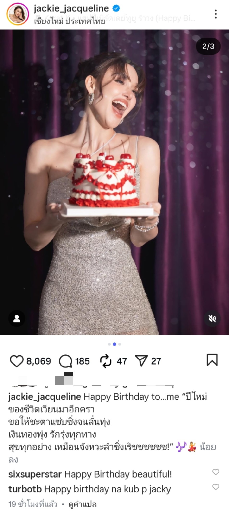 ​ทันทีที่โพสต์ดังกล่าวเผยแพร่ออกไป ก็มีเพื่อนพ้องคนบันเทิงและแฟนคลับจำนวนมากเข้ามาร่วมอวยพรและแสดงความเห็นถึงความเริ่ดของคำอวยพรนี้กันอย่างล้นหลาม อาทิ “เริ่ดดดดดดดดดดดด HBDเน้ออออออม่วน ๆ จอย ๆ สุขภาพแข็งแรง จุฟ ๆ” “hbd นะจ๊ะคนสวย ขอให้ปัง ๆ ร่ำรวย แข็งแรง ๆ” และ “สุขสันต์วันเกิดจ้าววววคนงาม ม่วน ๆ จอย ๆ ตลอดไปค่าาา” แสดงให้เห็นว่าไม่ว่าจะปีไหนๆ ‘แจ็คกี้ ชาเคอลีน’ ก็ยังคงเป็นที่รักและสร้างรอยยิ้มให้กับทุกคนได้อย่างไม่เคยเปลี่ยน! ทีมงานทีวีพูลก็ขออวยพรให้สาวแจ็คกี้ ชะตาแซ่บซิ่ง สมดังคำอวยพรนะคะ!