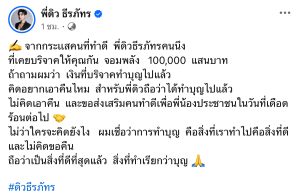 จากกระเเสคนที่ทำดี พี่ดิวธีรภัทรคนนึง ที่เคยบริจาคให้คุณกัน จอมพลัง 100,000 แสนบาท ถ้าถามผมว่า เงินที่บริจาคทำบุญไปแล้ว คิดอยากเอาคืนไหม สำหรับพี่ดิวถือว่าได้ทำบุญไปแล้ว ไม่คิดเอาคืน และขอส่งเสริมคนทำดีเพื่อพี่น้องประชาชนในวันที่เดือดร้อนต่อไป 🤝 ไม่ว่าใครจะคิดยังไง ผมเชื่อว่าการทำบุญ คือสิ่งที่เราทำไปคือสิ่งที่ดีและไม่คิดขอคืน ถือว่าเป็นสิ่งที่ดีที่สุดแล้ว สิ่งที่ทำเรียกว่าบุญ 🙏