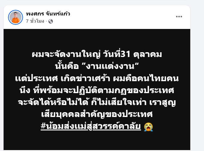 เเต่ประเทศ เกิดข่าวเศร้า ผมคือคนไทยคนนึง ที่พร้อมจะปฏิบัติตามกฏของประเทศ จะจัดได้หรือไม่ได้ ก็ไม่เสียใจเท่า เราสูญเสียบุคคลสำคัญของประเทศ
