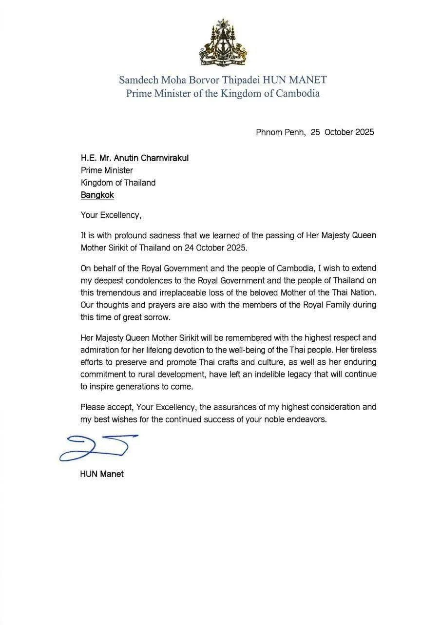 ฮุน มาเนต นายกรัฐมนตรีแห่งราชอาณาจักรกัมพูชา ได้ส่งหนังสือถึงนายอนุทิน ชาญวีรกูล นายกรัฐมนตรีแห่งราชอาณาจักรไทย เพื่อแสดงความเสียใจอย่างสุดซึ้งต่อการเสด็จสวรรคตของ สมเด็จพระนางเจ้าสิริกิติ์ พระบรมราชินีนาถ พระบรมราชนนีพันปีหลวง เมื่อวันที่ 24 ตุลาคม 2568 ความว่า