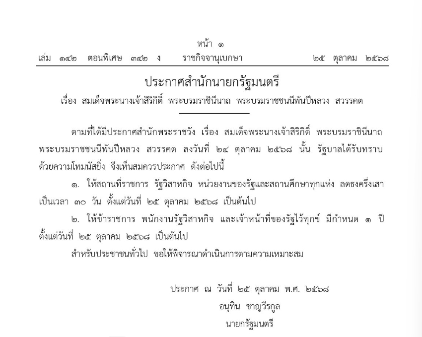 ตามที่ได้มีประกาศสำนักพระราชวัง เรื่อง สมเด็จพระนางเจ้าสิริกิติ์ พระบรมราชินีนาถ พระบรมราชชนนีพันปีหลวง สวรรคต ลงวันที่ 24 ตุลาคม 2568 นั้น รัฐบาลได้รับทราบด้วยความโทมนัสยิ่ง จึงเห็นสมควรประกาศ ดังต่อไปนี้
