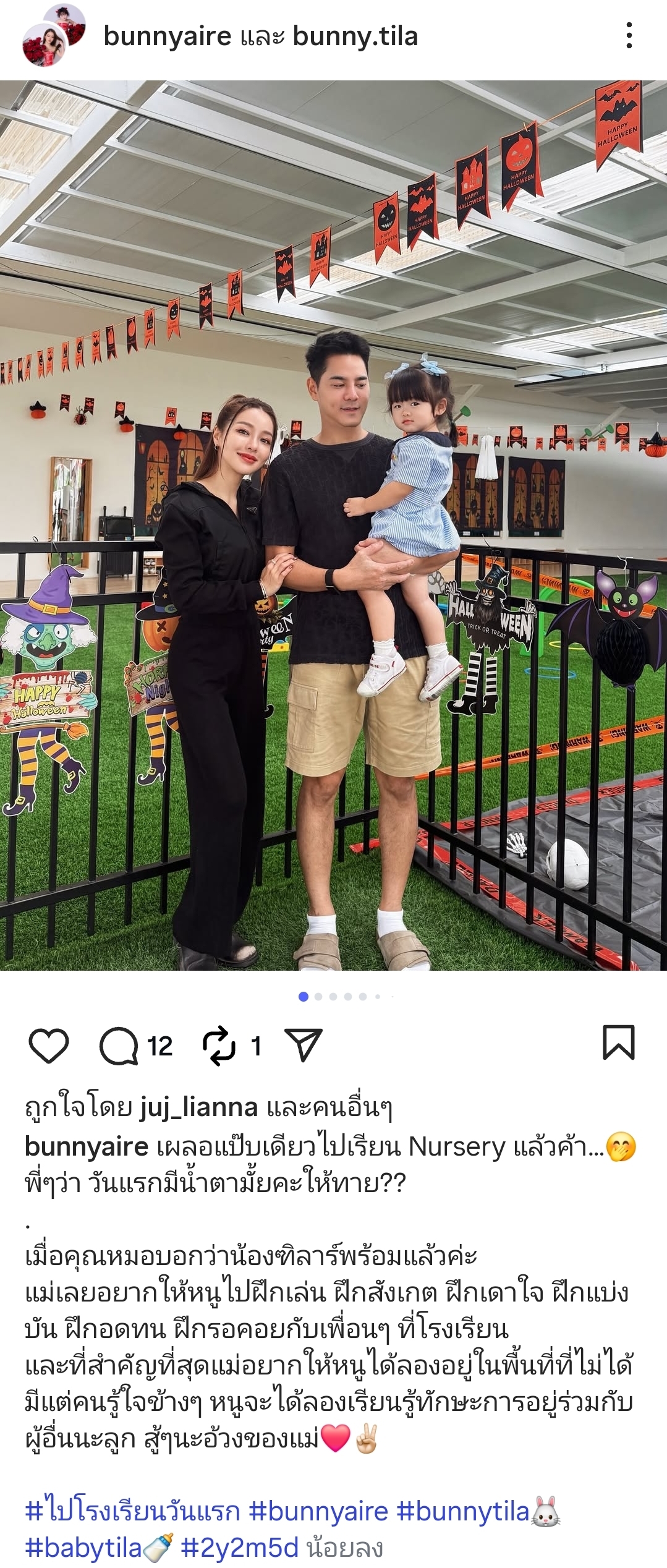 แอร์ ภัณฑิลา ได้ระบุข้อความอย่างน่ารักว่า “พี่ ๆ ว่า มีน้ำตามั้ยคะให้ทาย?? เผลอแป๊บเดียวไปเรียน Nursery แล้วค้า…🤭 เมื่อคุณหมอบอกว่าน้องฑิลาร์พร้อมแล้วค่ะ แม่เลยอยากให้หนูไปฝึกเล่น ฝึกสังเกต ฝึกเดาใจ ฝึกแบ่งบัน ฝึกอดทน ฝึกรอคอยกับเพื่อน ๆ ที่โรงเรียน และที่สำคัญที่สุดแม่อยากให้หนูได้ลองอยู่ในพื้นที่ที่ไม่ได้มีแต่คนรู้ใจข้าง ๆ หนูจะได้ลองเรียนรู้ทักษะการอยู่ร่วมกับผู้อื่นนะลูก สู้ ๆ นะอ้วงของแม่❤️✌🏻”