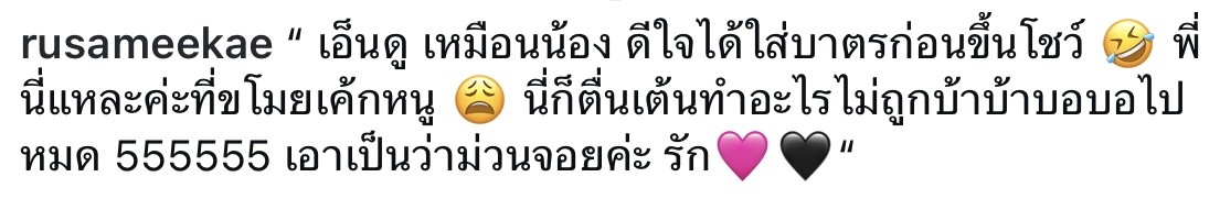“เอ็นดู เหมือนน้อง ดีใจได้ใส่บาตรก่อนขึ้นโชว์ 🤣 พี่นี่แหละค่ะที่ขโมยเค้กหนู 😩 นี่ก็ตื่นเต้นทำอะไรไม่ถูก บ้าบ้าบอบอไปหมด 555555 เอาเป็นว่าม่วนจอยค่ะ รัก🩷🖤”