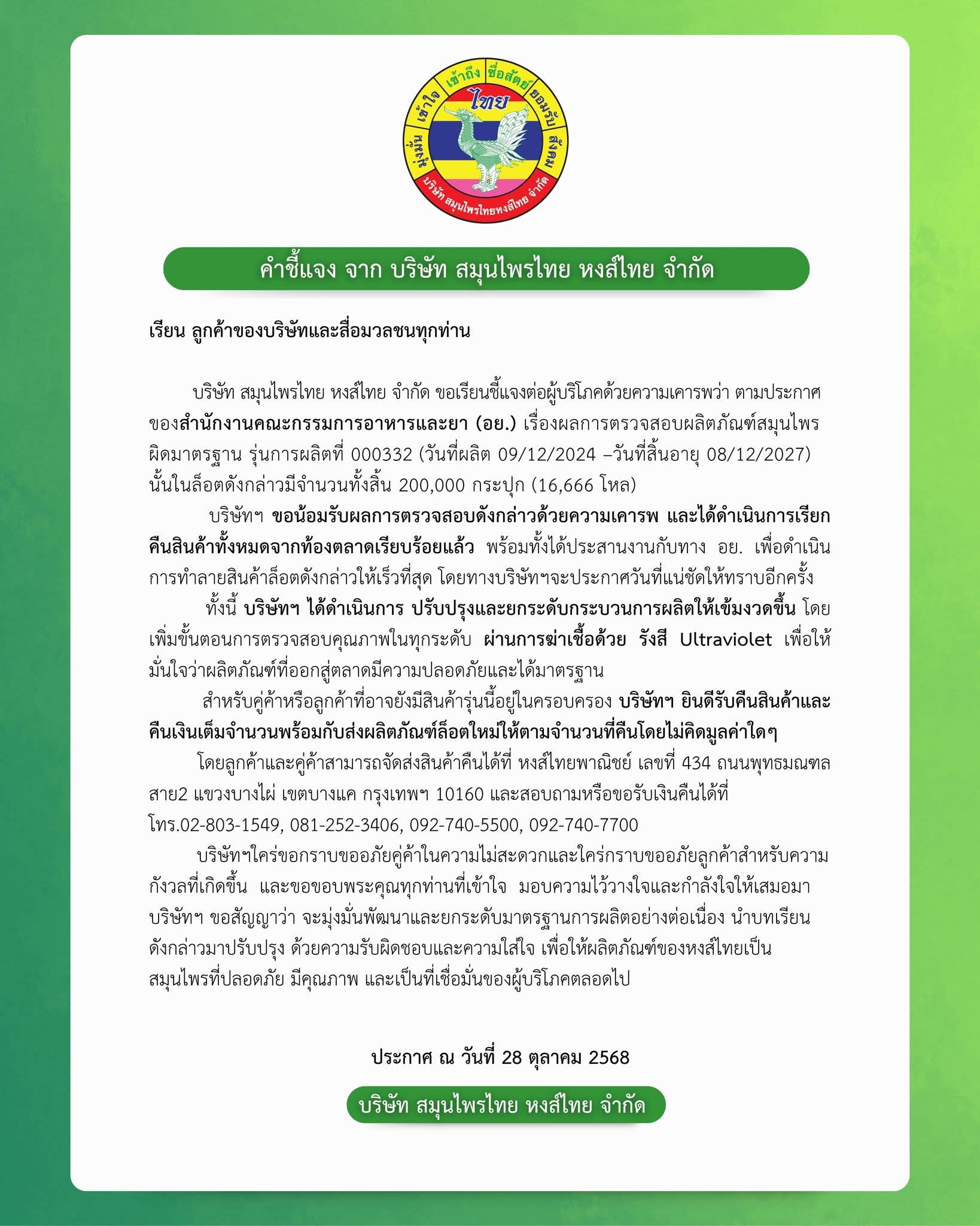 บริษัท สมุนไพร หงส์ไทย จำกัด ได้ออกแถลงการณ์อย่างเป็นทางการในวันนี้ (28 ต.ค. 2568) ชี้แจงว่า ผลิตภัณฑ์ที่ อย. ตรวจพบปัญหานั้น เป็น ยาดมสมุนไพร รุ่น 000332 ซึ่งมีวันที่ผลิต 09/12/2564 และวันสิ้นอายุ 08/12/2567 ซึ่งเป็นล็อตการผลิตเก่า
