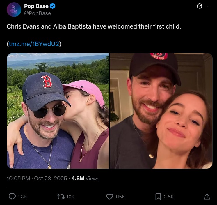 “กัปตันอเมริกา” วัย 44 ปีคริส อีแวนส์(คริส อีแวนส์)  กลายเป็นคุณพ่อเต็มตัวแล้ว! หลังต้อนรับลูกสาวคนแรกกับนักแสดงสาวชาวโปรตุเกส อัลบา บัปติสตา (Alba Baptista)