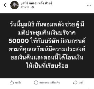 อัพเดตล่าสุด 30 ตุลาคม 68 ทางเพจเฟซบุ๊ก มูลนิธิกันจอมพลังช่วยสู้ ได้โพสต์ข้อความ ระบุว่า วันนี้มูลนิธิ กันจอมพลัง ช่วยสู้ มีมติประชุมคืนเงินบริจาค 50000 ให้กับบริษัท มิสแกรนด์ ตามที่คุณณวัฒน์มีความประสงค์ขอเงินคืนและตอนนี้ได้โอนเงินให้เป็นที่เรียบร้อย