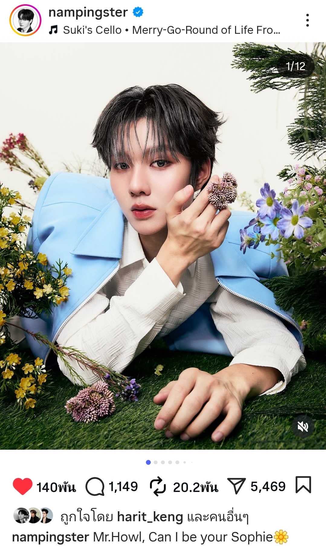 ในเซ็ตภาพชุดนี้ เก่ง หฤษฎ์ สวมบทบาทเป็น ฮาวล์ (Howl) พ่อมดหนุ่มรูปงามที่มีบุคลิกซับซ้อน ทั้งในลุคสีดำสุดดาร์กที่เต็มไปด้วยขนนกสีดำอันน่าค้นหา พร้อมเล็บยาวสีเงินดุดัน และในลุคเสื้อเชิ้ตสีขาวพลิ้วไหวที่แสดงถึงความอ่อนโยนและอิสระ ส่วน น้ำปิง นภัสกร เลือกคอสเพลย์เป็น โซฟี (Sophie) ตัวเอกหญิงของเรื่อง ที่มาในชุดสีฟ้า-ขาวสะอาดตา โดยเฉพาะภาพคู่ที่ทั้งสองนอนเคียงข้างกันบนพื้นหญ้าที่รายล้อมไปด้วยดอกไม้นานาชนิดนั้น ถูกยกให้เป็นภาพที่ “เคมีดีต่อใจ” และโรแมนติกที่สุด