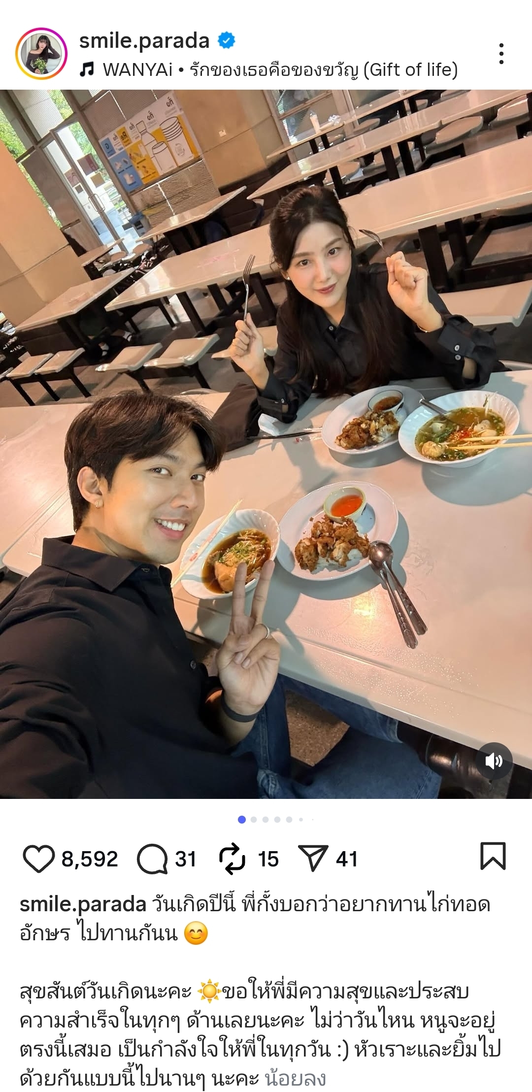 ”วันเกิดปีนี้ พี่กั้งบอกว่าอยากทานไก่ทอดอักษร ไปทาน กัน สุขสันต์วันเกิดนะคะ ขอให้พี่มีความสุขและประสบความสำเร็จในทุกๆ ด้านเลยนะคะ ไม่ว่าวันไหน หนูจะอยู่ตรงนี้เสมอ เป็นกำลังใจให้พี่ในทุกวัน หัวเราะและยิ้มไปด้วยกันแบบนี้ไปนานๆ นะคะ”