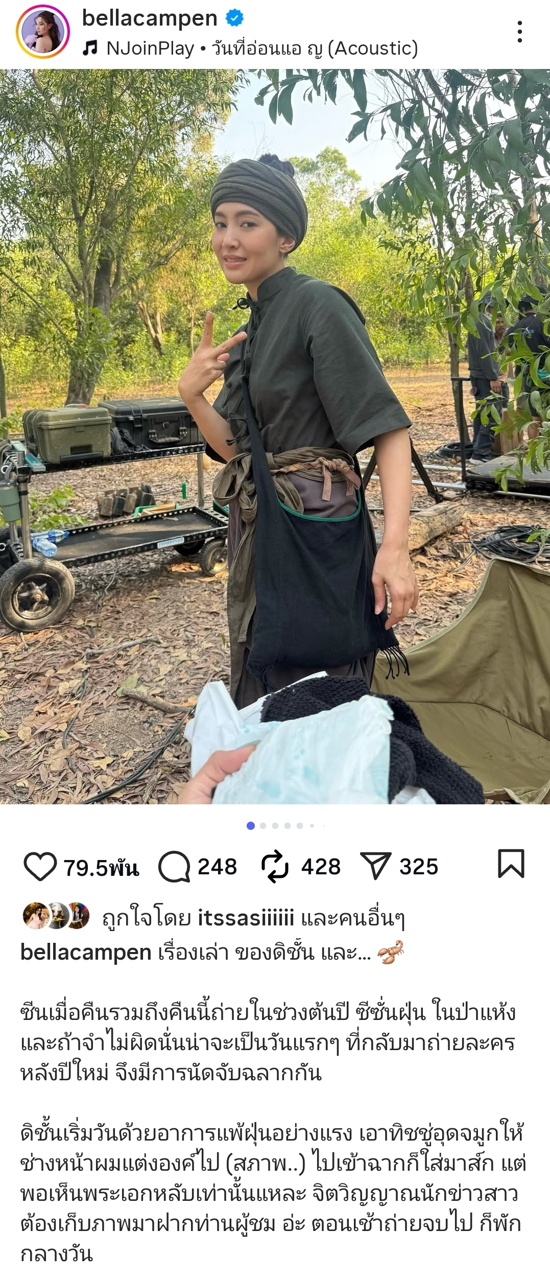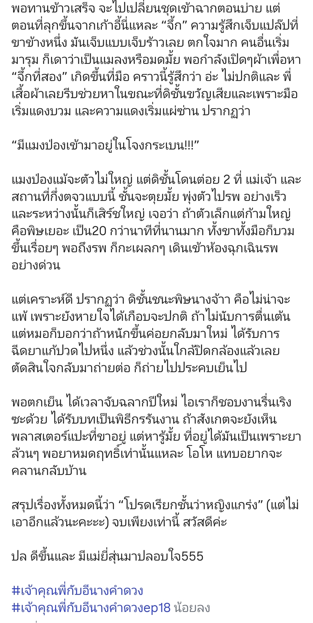 ​โดยสาวเบลล่าได้เล่าผ่านอินสตาแกรมถึงเหตุการณ์ไม่คาดฝันในวันที่ถ่ายทำที่ต้องเข้าป่าแห้ง โดยเริ่มต้นวันด้วยอาการแพ้ฝุ่นอย่างหนัก แต่ก็ยังคงสวมสปิริตทำงานต่ออย่างเต็มที่ แต่เหตุการณ์ช็อกก็เกิดขึ้นหลังพักกลางวัน เมื่อเธอกำลังจะลุกขึ้นไปเปลี่ยนชุดเพื่อเข้าฉากตอนบ่าย ทันใดนั้นก็รู้สึก “เจ็บแปล๊บที่ขาข้างหนึ่ง” ชนิดเจ็บร้าว! ในช่วงที่กำลังหาว่าเกิดอะไรขึ้น ก็เกิดอาการ “จึ้กที่สอง” ขึ้นที่มือ!