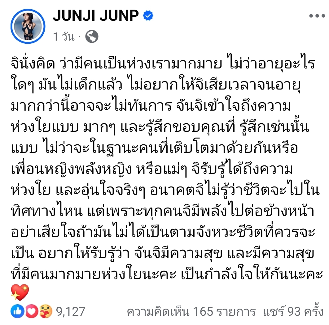 จันจิได้โพสต์ข้อความยาวเหยียด ระบุว่าเธอรับรู้และเข้าใจถึงความห่วงใยเหล่านั้นเป็นอย่างดี โดยเฉพาะความกังวลที่ว่า “จินั่งคิด ว่ามีคนเป็นห่วงเรามากมาย ไม่ว่าอายุอะไรใดๆ มันไม่เด็กแล้ว ไม่อยากให้จิเสียเวลาจนอายุมากกว่านี้อาจจะไม่ทันการ”