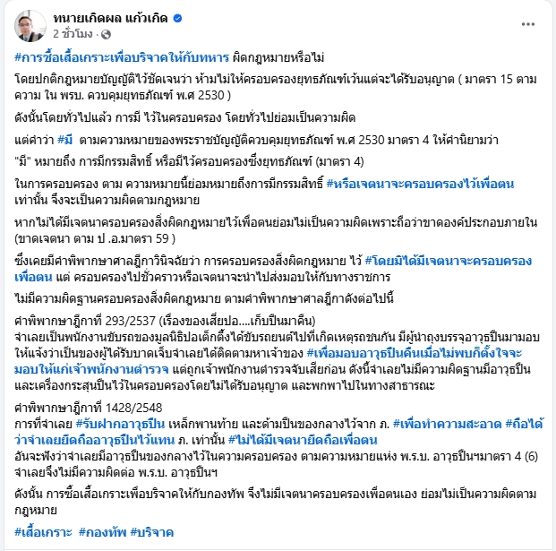 วันที่ 1 พ.ย.68 เพจ ทนายเกิดผล แก้วเกิด ได้โพสต์ข้อความว่า โดยปกติกฎหมายบัญญัติไว้ชัดเจนว่า ห้ามไม่ให้ครอบครองยุทธภัณฑ์เว้นแต่จะได้รับอนุญาต ( มาตรา 15 ตามความ ใน พรบ. ควบคุมยุทธภัณฑ์ พ.ศ 2530 )