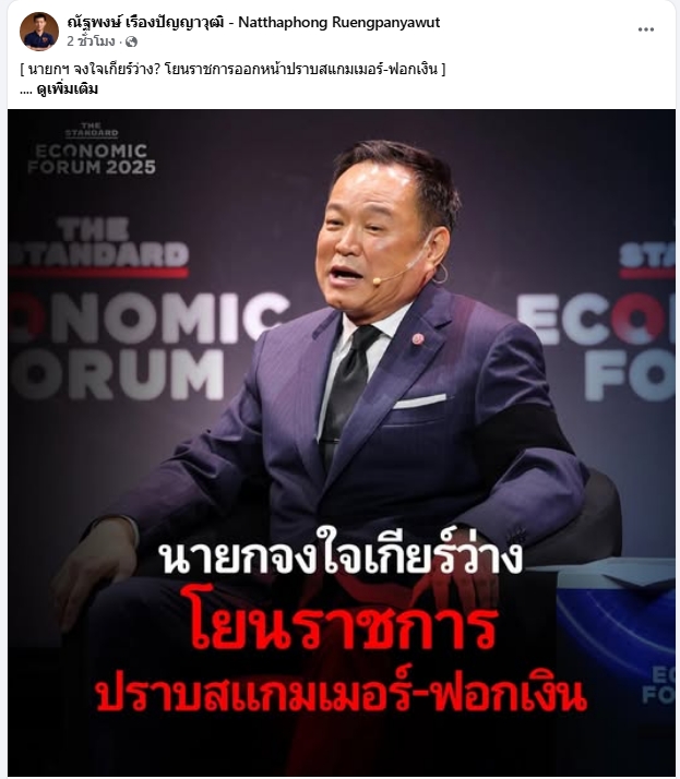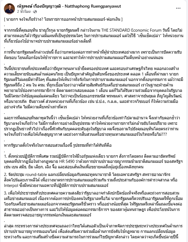 วันที่ 5 พ.ย. 2568 นายณัฐพงษ์ เรืองปัญญาวุฒิ สส.บัญชีรายชื่อ หัวหน้าพรรคประชาชน (ปชน.) ในฐานะผู้นำฝ่ายค้านในสภาผู้แทนราษฎร แสดงความคิดเห็นจากกรณีนายอนุทิน ชาญวีรกูล นายกรัฐมนตรี กล่าวในงาน The Standard Economic Forum วันนี้ โดยไม่สามารถตอบได้ว่ารัฐบาลมีแผนที่เป็นรูปธรรมใดๆ ในการปราบสแกมเมอร์ แต่ใช้วิธี “เซ็นเช็คเปล่า” ให้หน่วยงานที่เกี่ยวข้องใช้อำนาจปราบปรามสแกมเมอร์อย่างเต็มที่ ว่า การที่นายกรัฐมนตรีกล่าวเช่นนี้ ถือว่าบกพร่องต่อการทำหน้าที่ผู้นำประเทศอย่างมาก เพราะเป็นการปัดความรับผิดขอบ โยนเผือกร้อนให้ข้าราชการ และจะทำให้การปราบปรามสแกมเมอร์ไม่คืบหน้าอย่างแน่นอน