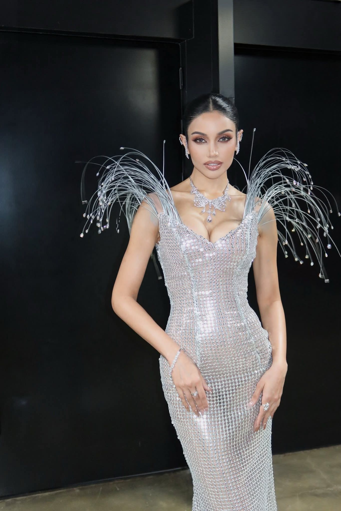 แว่วๆ มาว่าลุคนี้ทำเอาช่างภาพต่างชาติลั่นชัตเตอร์กันไม่หยุด! ก็ดูชุดสิคะคู๊ณณณ…อะไรมันจะอลังการเบอร์นั้น! ชุดราตรีสีเงินระยิบระยับดุจคริสตัลล้านเม็ด ส่องสว่างทะลุจอ! แต่ที่ทำเอาอ้าปากค้างก็คือดีเทลตรงช่วงบ่านั่นแหละค่ะแม่…มันฟุ้ง…มันล้ำ…มันเหมือนแสงดาวแตกกระจายออกจากร่าง!