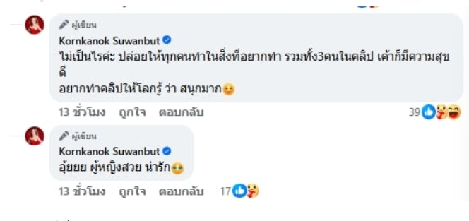 “อุ้ยยย ผู้หญิวสวย น่ารัก ไม่เป็นไรค่ะ ปล่อยให้ทุกคนทำในสิ่งที่อยากทำ รวมทั้ง 3 คนในคลิป เค้าก็มีความสุขดี อยากทำคลิปให้โลกรู้ว่าสนุกมาก”