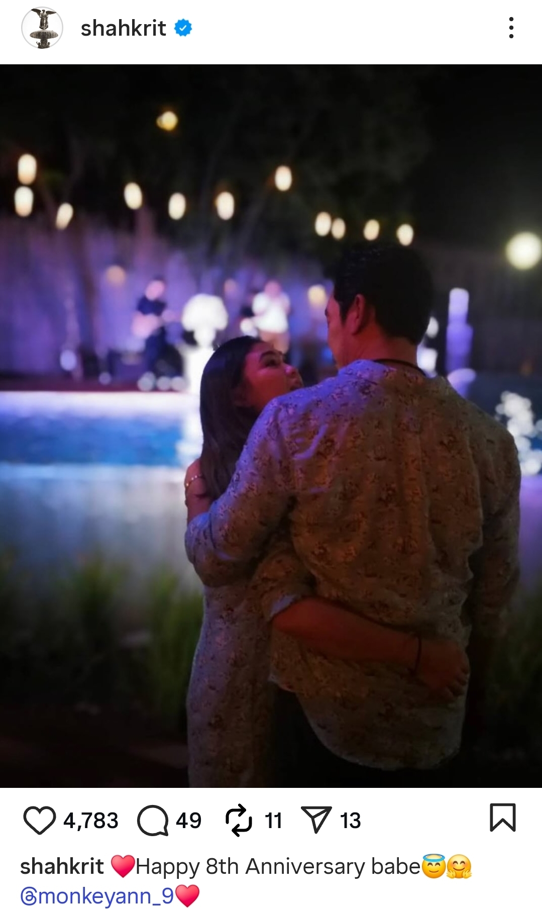 ในวันครบรอบแต่งงานปีที่ 8 นี้ ทางด้านสามีอย่าง ชาคริต แย้มนาม ได้โพสต์ภาพคู่ภรรยาด้วยรอยยิ้มที่มีความสุข พร้อมเขียนแคปชันสั้น ๆ แต่ได้ใจความว่า “Happy 8th Anniversary babe @monkeyann_9” เป็นการยืนยันความรักที่มั่นคงต่อภรรยาและแม่ของลูก ซึ่งความเรียบง่ายแต่จริงใจนี้สร้างความประทับใจให้กับผู้ที่ติดตามเป็นอย่างมาก
