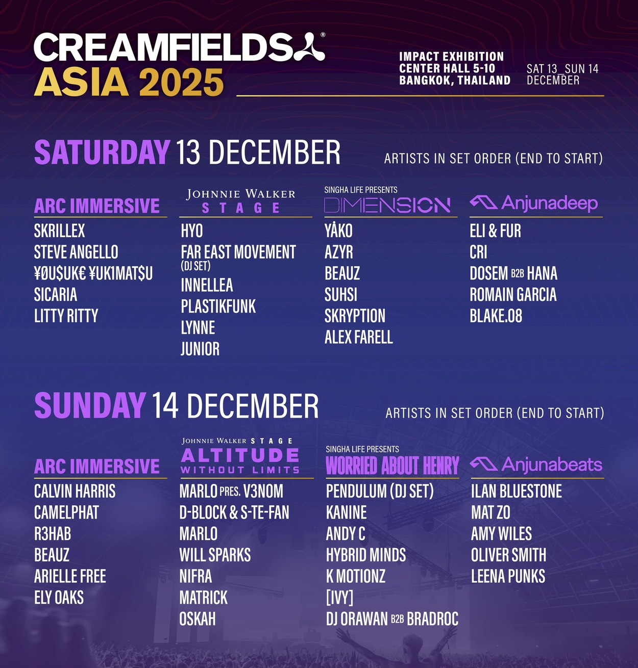 นอกจาก HYO แล้ว งานนี้ยังมีไลน์อัปศิลปินเอเชียตบเท้าเข้าร่วมจอยบน 4 เวที และพื้นที่ 33,000 ตารางเมตร อย่าง BEAUZ, Litty Ritty, Yousuke Yukimatsu (เวทีหลัก ARC Immersive) Far East Movement, Junior, LYNNE (เวที Johnnie Walker Stage) BradRoc, DJ ORAWAN (เวที Singha Life Presents Worried About Henry) SUHSI, Yako (เวที Singha Life Presents DIMENSION) สายแดนซ์ตัวจริงต้องไม่พลาด