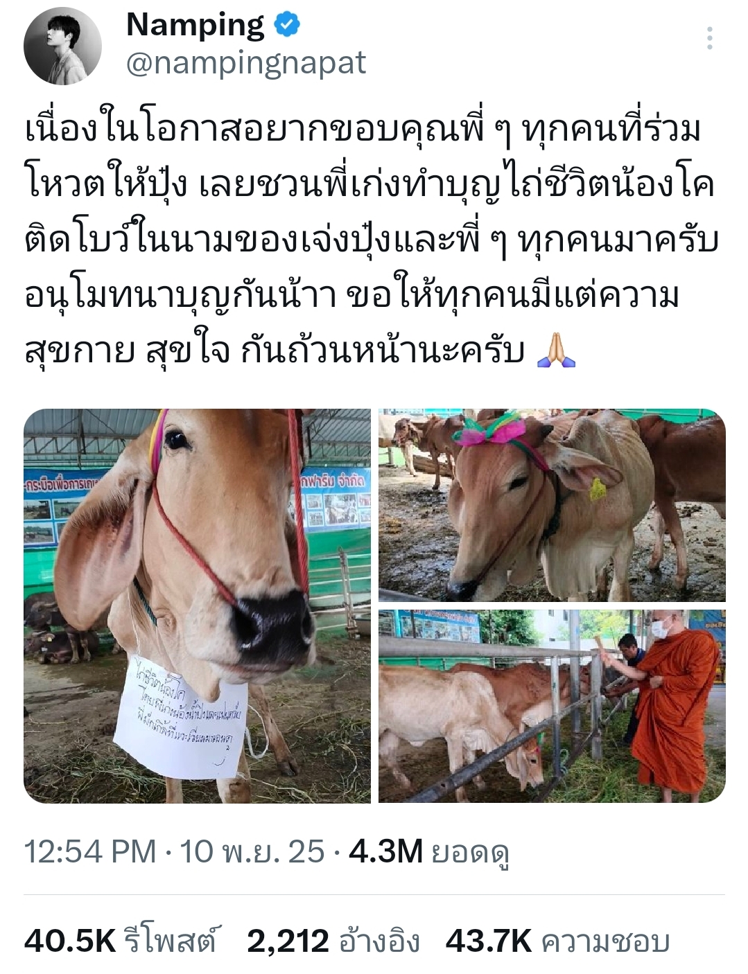 หนุ่มน้ำปิงได้ลงภาพพร้อมกับโคกระบือที่ถูกประดับด้วยโบว์อย่างน่ารัก พร้อมระบุข้อความว่า “เนื่องในโอกาสอยากขอบคุณพี่ๆ ทุกคนที่ร่วมโหวตให้ปุ๋ง เลยชวนพี่เก่งทำบุญไถ่ชีวิตน้องโคติดโบว์ในนามของเจ่งปุ๋งและพี่ๆ ทุกคนมาครับ อนุโมทนาบุญกันน้าา ขอให้ทุกคนมีแต่ความสุขกาย สุขใจ กันถ้วนหน้านะครับ” ซึ่งเป็นการทำบุญร่วมกันในนามของ “เจ่งปุ๋ง” และพี่ ๆ แฟนคลับทุกคน ถือเป็นการส่งต่อบุญกุศลและความสุขอย่างแท้จริง