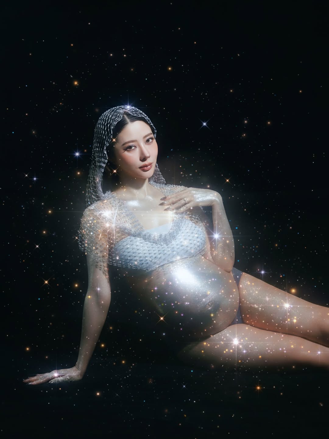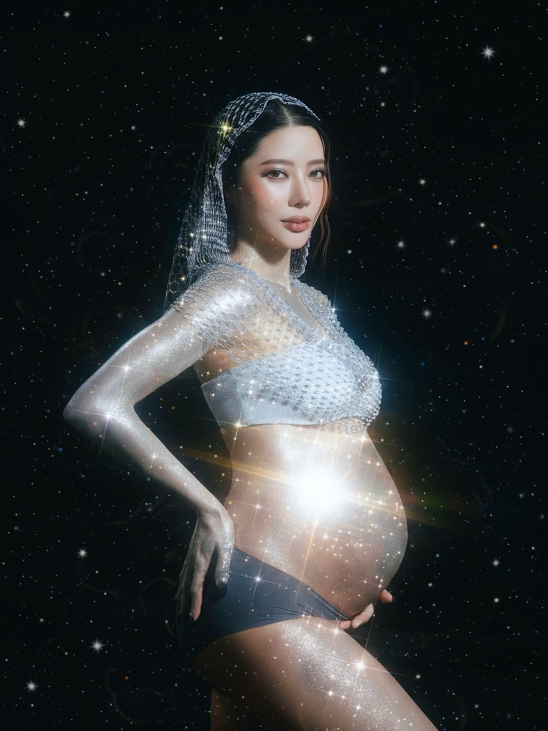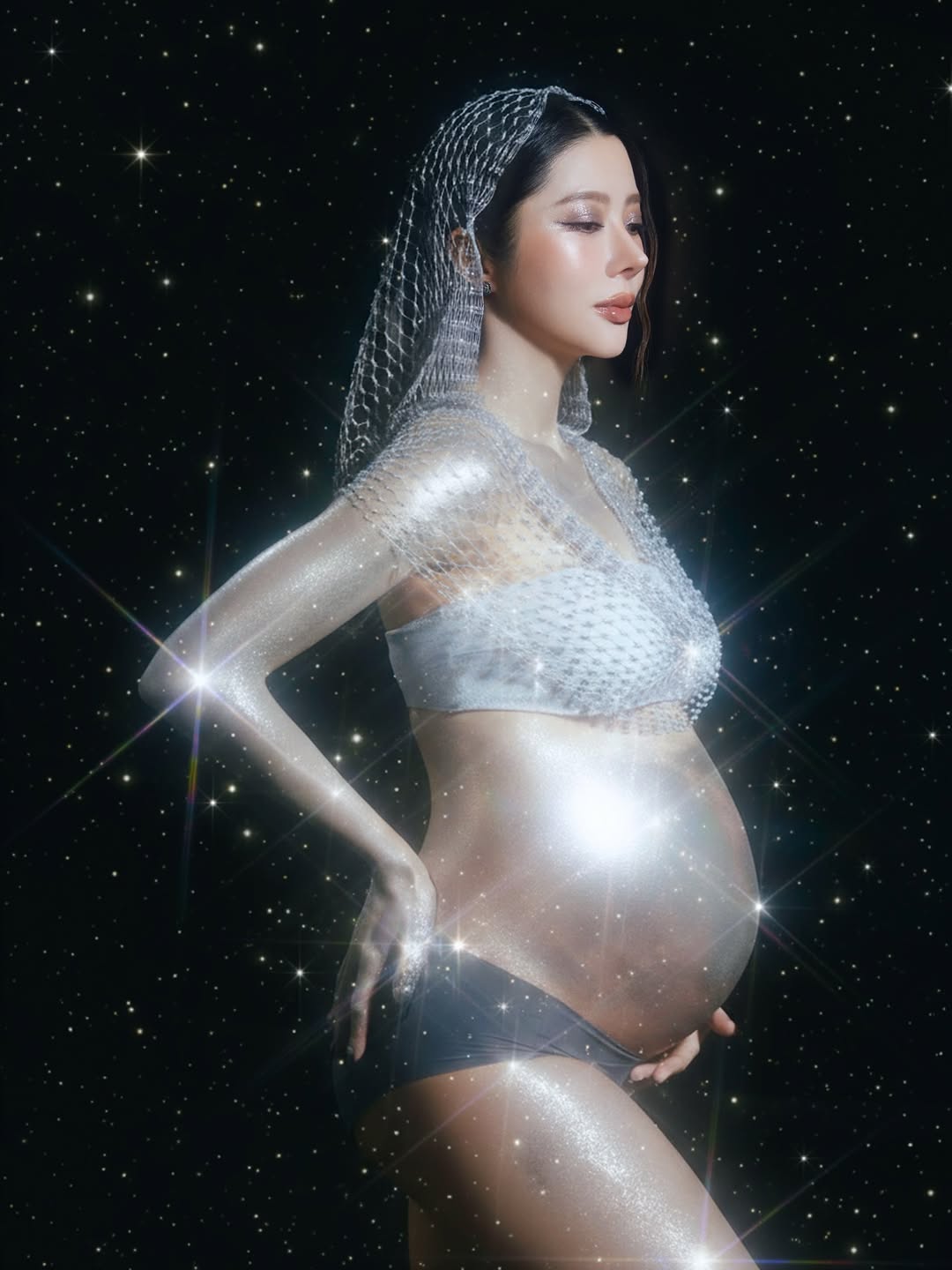 แฟชั่นเซ็ตนี้มาในคอนเซ็ปต์สุดล้ำราวกับ “นางฟ้าจากต่างดาว” หรือ “ออร่าจักรวาล” โดยสาวเนยมาในชุดตาข่ายเพชรระยิบระยับที่ปกคลุมทั้งร่างกาย เผยให้เห็นหน้าท้องกลมโตที่ถูกแต่งแต้มด้วยกากเพชรสีเงินเปล่งประกายทั่วทั้งท้อง พร้อมกับแคปชั่นสุดเก๋ว่า “Carrying something celestial inside me” (กำลังอุ้มสิ่งที่มาจากสรวงสวรรค์ไว้ในตัวฉัน)