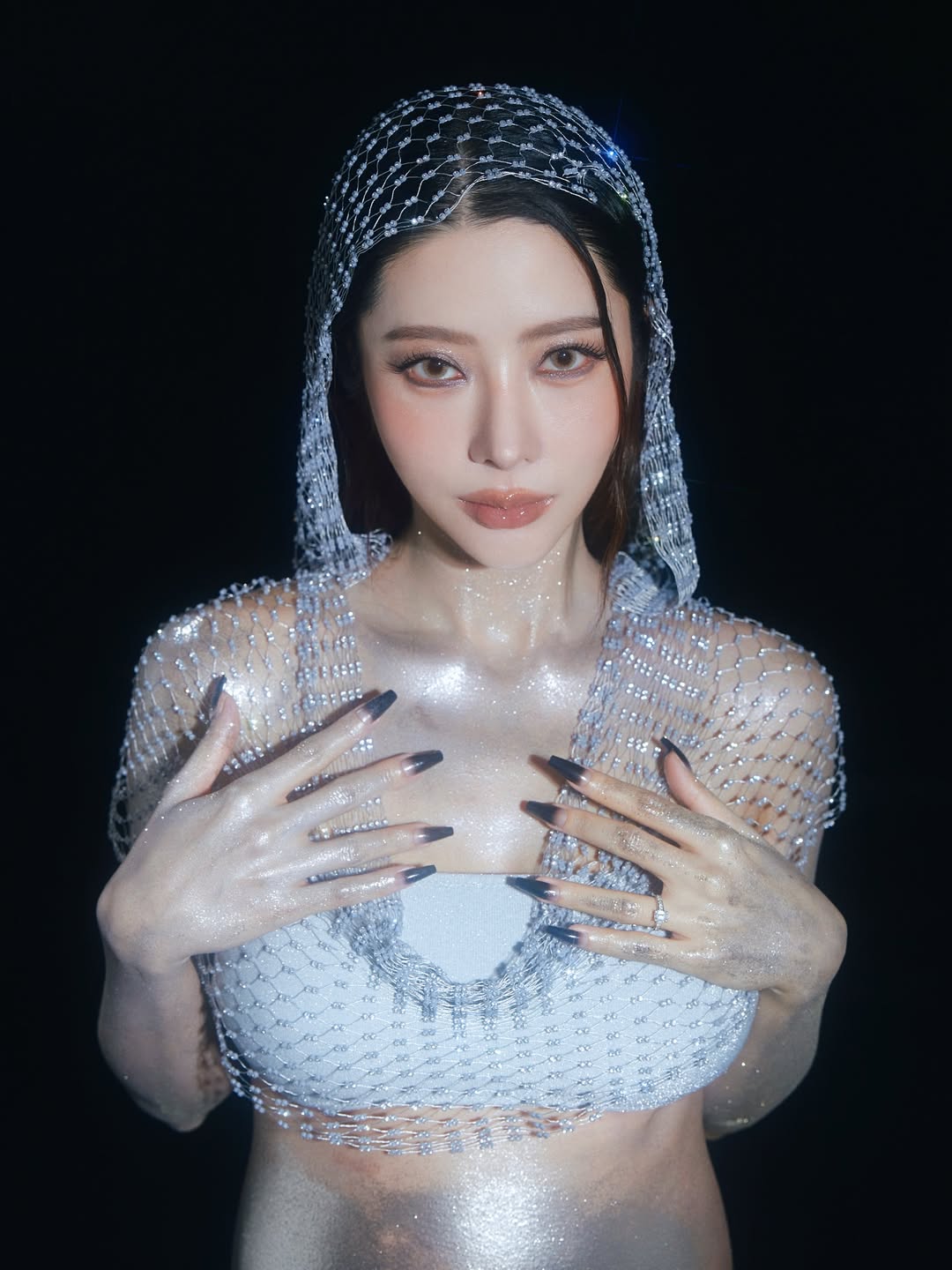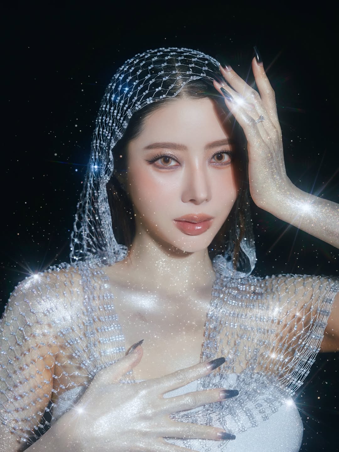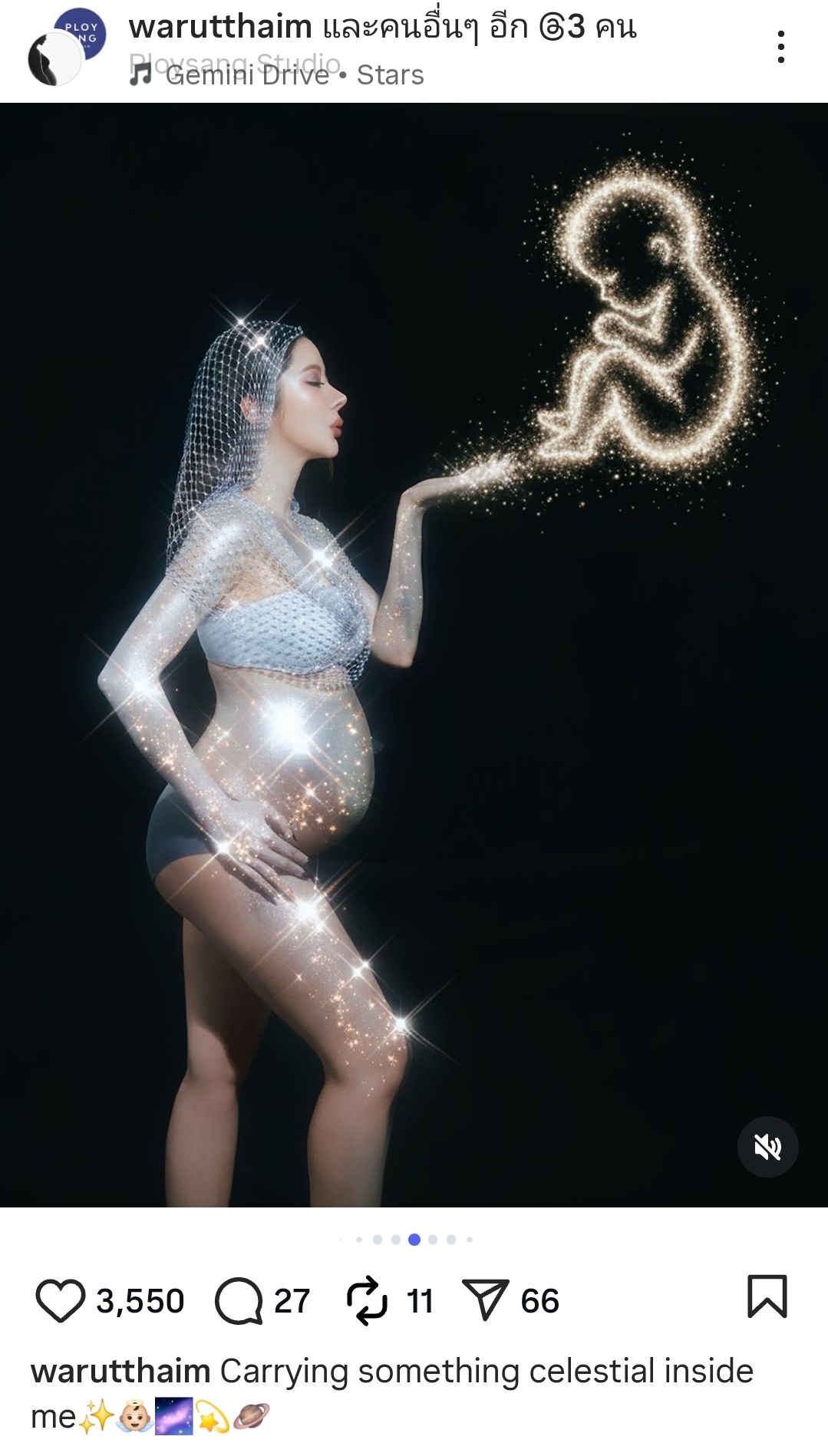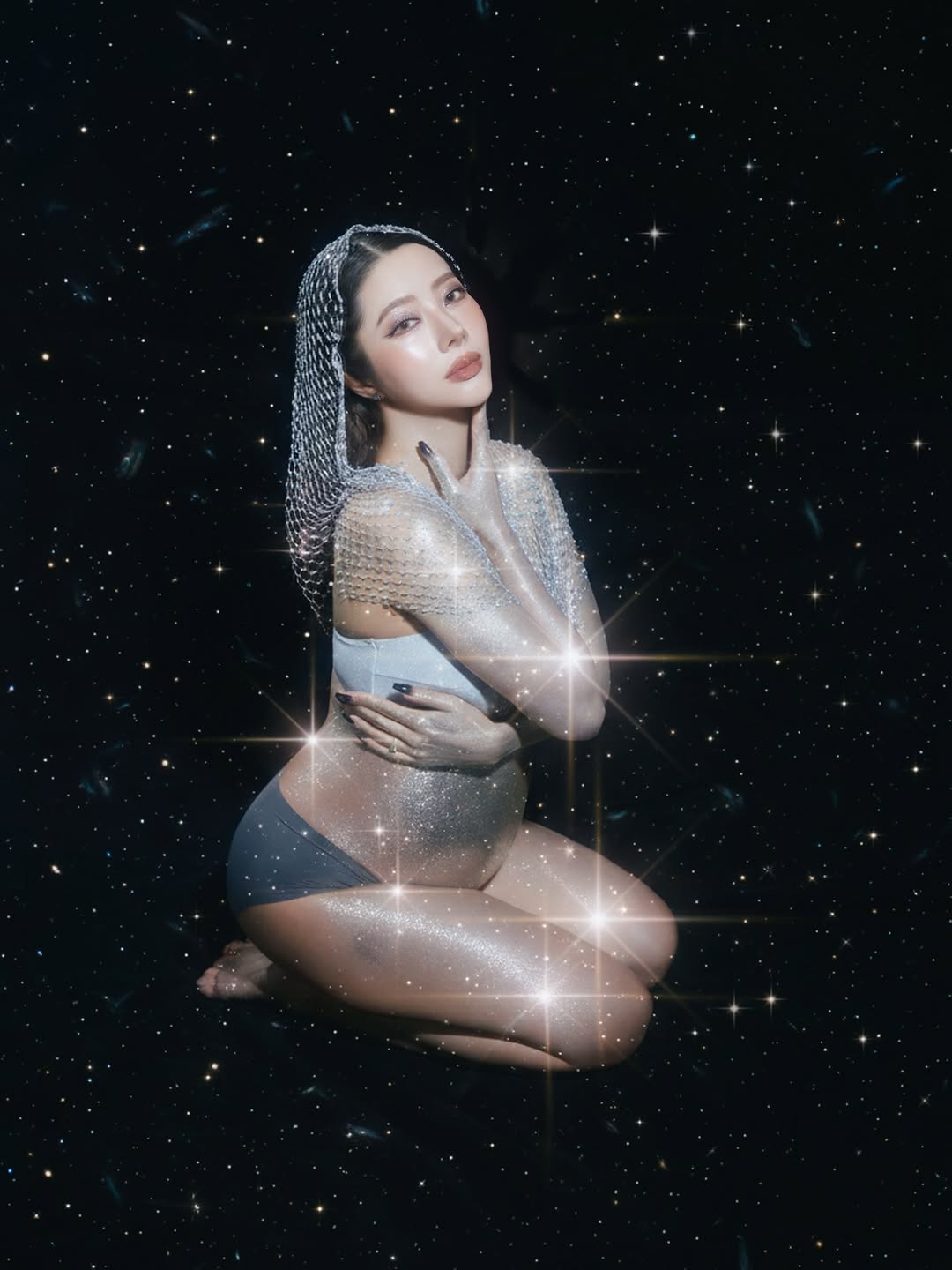 แฟชั่นเซ็ตนี้มาในคอนเซ็ปต์สุดล้ำราวกับ “นางฟ้าจากต่างดาว” หรือ “ออร่าจักรวาล” โดยสาวเนยมาในชุดตาข่ายเพชรระยิบระยับที่ปกคลุมทั้งร่างกาย เผยให้เห็นหน้าท้องกลมโตที่ถูกแต่งแต้มด้วยกากเพชรสีเงินเปล่งประกายทั่วทั้งท้อง พร้อมกับแคปชั่นสุดเก๋ว่า “Carrying something celestial inside me” (กำลังอุ้มสิ่งที่มาจากสรวงสวรรค์ไว้ในตัวฉัน)
