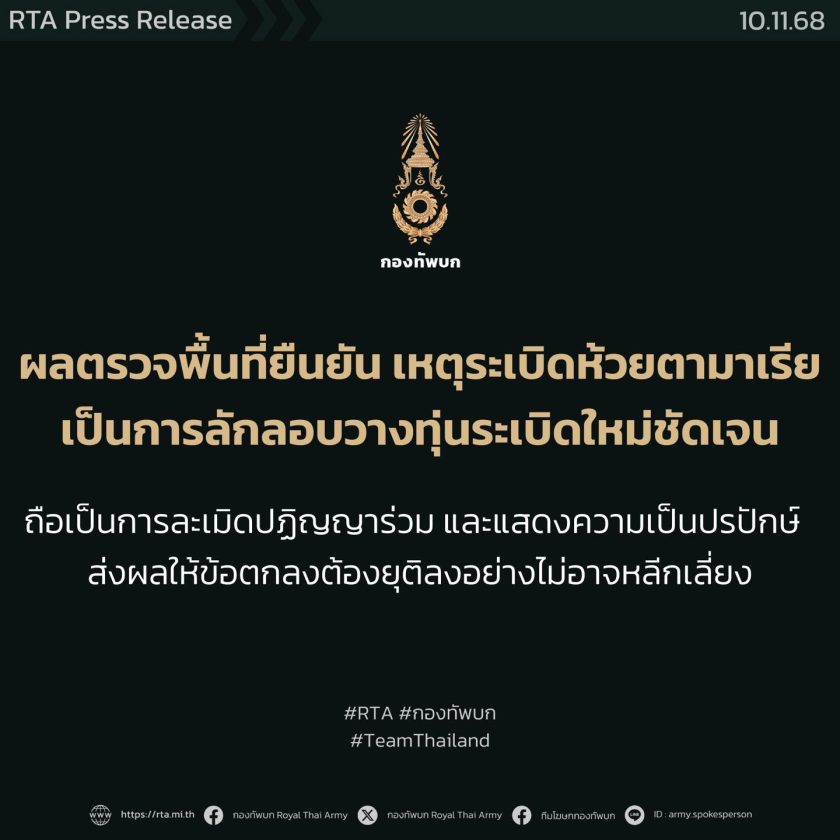 กองทัพบกยืนยันเหตุระเบิดห้วยตามาเรีย เป็นการลักลอบวางทุ่นระเบิดใหม่ ถือเป็นการละเมิดปฏิญญาร่วม และแสดงความเป็นปรปักษ์ อันส่งผลให้ข้อตกลงต้องยุติลงอย่างไม่อาจหลีกเลี่ยง