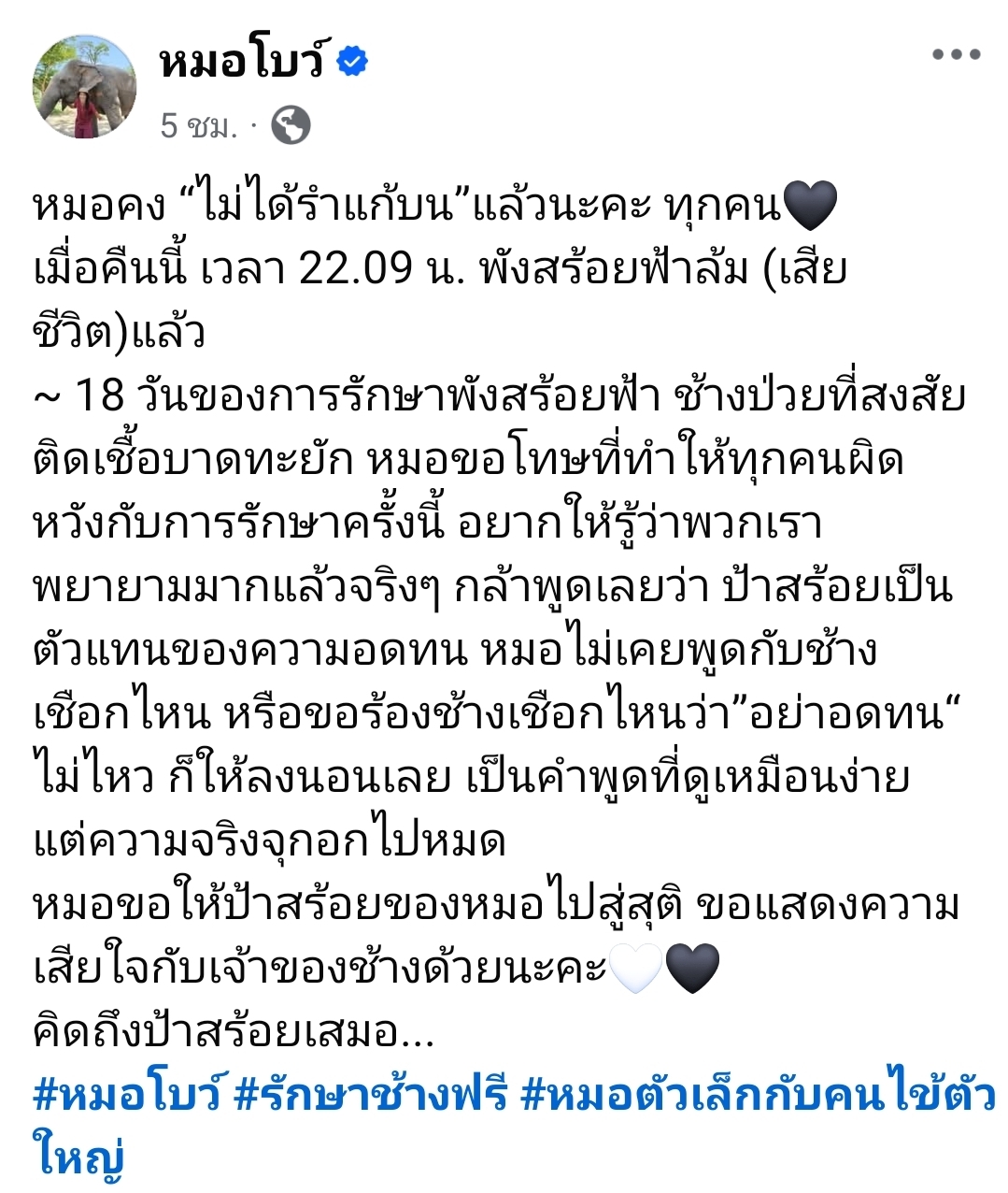 โพสต์ดังกล่าวได้เน้นย้ำถึงความพยายามของทีมงาน และความรู้สึกผิดหวังที่ไม่อาจช่วยชีวิตช้างเชือกนี้ไว้ได้ หมอโบว์ได้กล่าวขอโทษต่อสาธารณชน แต่ยืนยันว่าการรักษาเป็นไปอย่างสุดความสามารถ และกล้าที่จะกล่าวถึง “ป้าสร้อย” ว่าเป็น “ตัวแทนของความอดทน”