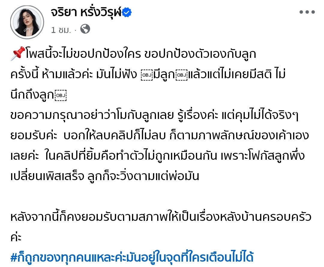 งานนี้ชีแม่ขอ “ไม่ปกป้องใคร ขอปกป้องตัวเองกับลูก” ยอมรับแบบแมนๆ ว่า “ห้ามแล้วค่ะ แต่มันไม่ฟัง” พร้อมซัดแรงเวอร์ว่าสามี “มีลูกแล้วแต่ไม่เคยมีสติ ไม่นึกถึงลูก” …อุ๊ต๊ะ! แรงมากแม่!