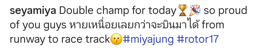 การแข่งขันอันดุเดือดที่สนามสมโภชเชียงใหม่ 700 ปี เมื่อวันที่ 15-16 พ.ย. ที่ผ่านมา ถูกเติมเต็มด้วยความตื่นเต้นเมื่อสองพี่น้อง “ทองเจือ” ได้แสดงศักยภาพการขับขี่ที่ยอดเยี่ยมจนคว้าชัยชนะมาครองได้สำเร็จ โดยเฉพาะอย่างยิ่งการเดินทางมาเพื่อแข่งขันในครั้งนี้ก็ไม่ธรรมดา เพราะคุณแม่ เจ็ง ได้เผยถึงความทุ่มเทในอินสตาแกรมส่วนตัวว่าลูก ๆ ต้อง “บินตรงกลับมารับแชมป์โดยเฉพาะ” พร้อมข้อความสุดซึ้งที่ว่า “หายเหนื่อยเลยกว่าจะบินมาได้ from runway to race track😗” ตอกย้ำถึงความมุ่งมั่นที่ไม่ยอมพลาดการแข่งขันครั้งสำคัญ